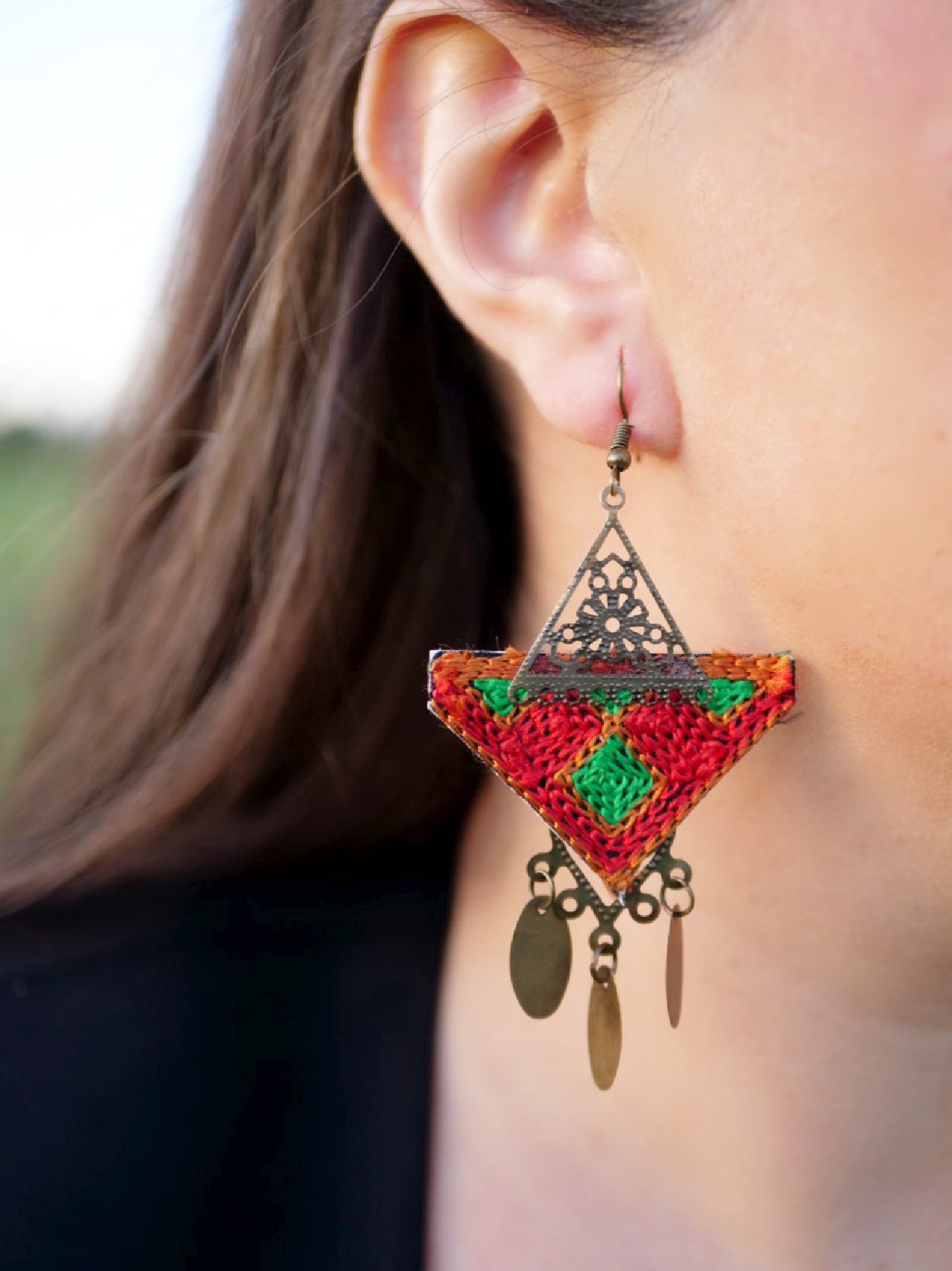 Crimson Dusk Bold and vibrant, Crimson Dusk earrings capture the fiery beauty of a sunset with red, green, and orange woven threads, paired with antique brass elements. The triangle shape and hanging coin-style charms add a touch of vintage elegance and folk art charm.